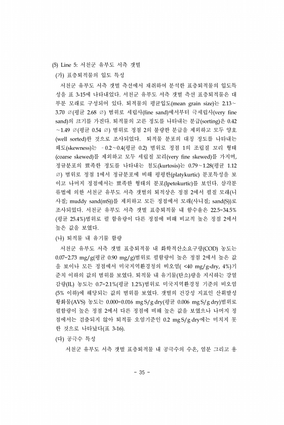 35 5 Line 5서천군 유부도 서측 갯벌 가 표층퇴적물의 입도 특성 서천군 유부도 서측 갯벌 측선에서 채취하여 분석한 표층퇴적물의 입도특 성을 표 3-15에 나타내었다. 서천군 유부도 서측 갯벌 측선 표층퇴적물은 대 부분 모래로 구성되어 있다. 퇴적물의 평균입도 mean grain size 는 2.13∼ 3.70 ? 평균 2.68 ? 범위로 세립사 fine sand 에서부터 극세립사 very fine sand 의 크기를 가진다. 퇴적물의 고른 정도를 나타내는 분급 sorting 은 0.42 ∼1.49 ? 평균 0.54 ? 범위로 정점 2의 불량한 분급을 제외하고 모두 양호 well sorted 한 것으로 조사되었다. 퇴적물 분포의 대칭 정도를 나타내는 왜도 skewness 는 ?0.2∼0.4 평균 0.2...