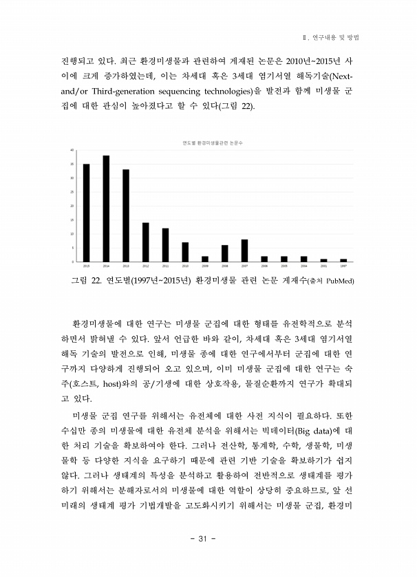 31 진행되고 있다 최근 환경미생물과 관련하여 게재된 논문은 년 년 사 이에 크게 증가하였는데 이는 차세대 혹은 세대 염기서열 해독기술 을 발전과 함께 미생물 군 집에 대한 관심이 높아졌다고 할 수 있다 그림 그림 연도별 년 년 환경미생물 관련 논문 게재수 출처 환경미생물에 대한 연구는 미생물 군집에 대한 형태를 유전학적으로 분석 하면서 밝혀낼 수 있다 앞서 언급한 바와 같이 차세대 혹은 세대 염기서열 해독 기술의 발전으로 인해 미생물 종에 대한 연구에서부터 군집에 대한 연 구까지 다양하게 진행되어 오고 있으며 이미 미생물 군집에 대한 연구는 숙 주 호스트 와의 공 기생에 대한 상호작용 물질순환까지 연구가 확대되 고 있다 미생물 군집 연구를 위해서는 유전체에 대한 사전 지식이 필요하다 또한 수십만 종의 미생...