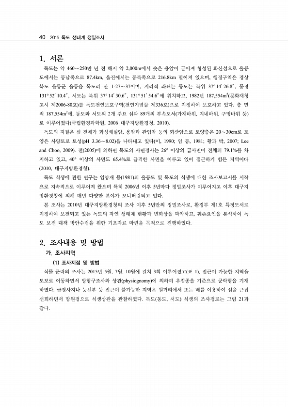 40 2015 독도 생태계 정밀조사 1. 서론 독도는 약 460∼250만 년 전 해저 약 2,000m에서 솟은 용암이 굳어져 형성된 화산섬으로 울릉 도에서는 동남쪽으로 87.4km, 울진에서는 동북쪽으로 216.8km 떨어져 있으며, 행정구역은 경상 북도 울릉군 울릉읍 독도리 산 1-27∼37이며, 지리적 좌표는 동도는 북위 37° 14′ 26.8″, 동경 131° 52′ 10.4″, 서도는 북위 37° 14′ 30.6″, 131° 51′ 54.6″에 위치하고, 1982년 187,554m2 문화재청 고시 제2006-80호 를 독도천연보호구역 천연기념물 제336호 으로 지정하여 보호하고 있다. 총 면 적 187,554m2에, 동도와 서도의 2개 주요 섬과 89개의 부속도서 가재바위, 지네바위, 구멍바위 등 로...
