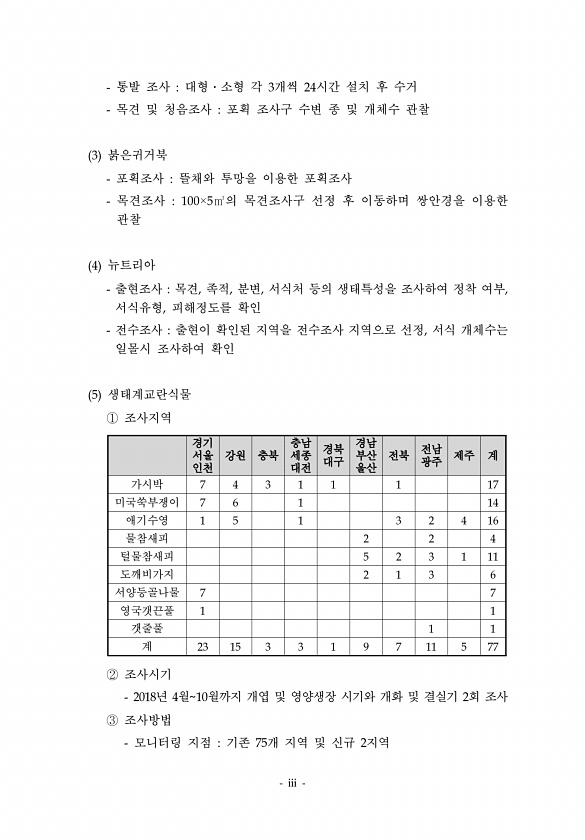iii 통발 조사 대형?소형 각 3개씩 24시간 설치 후 수거 목견 및 청음조사 포획 조사구 수변 종 및 개체수 관찰 3 붉은귀거북 포획조사 뜰채와 투망을 이용한 포획조사 목견조사 100×5㎡의 목견조사구 선정 후 이동하며 쌍안경을 이용한 관찰 4 뉴트리아 출현조사 목견, 족적, 분변, 서식처 등의 생태특성을 조사하여 정착 여부, 서식유형, 피해정도를 확인 전수조사 출현이 확인된 지역을 전수조사 지역으로 선정, 서식 개체수는 일몰시 조사하여 확인 5 생태계교란식물 ① 조사지역 경기 서울 인천 강원 충북 충남 세종 대전 경북 대구 경남 부산 울산 전북 전남 광주 제주 계 가시박 7 4 3 1 1 1 17 미국쑥부쟁이 7 6 1 14 애기수영 1 5 1 3 2 4 16 물참새피 2 2 4 털물참새피 5 2 3 ...