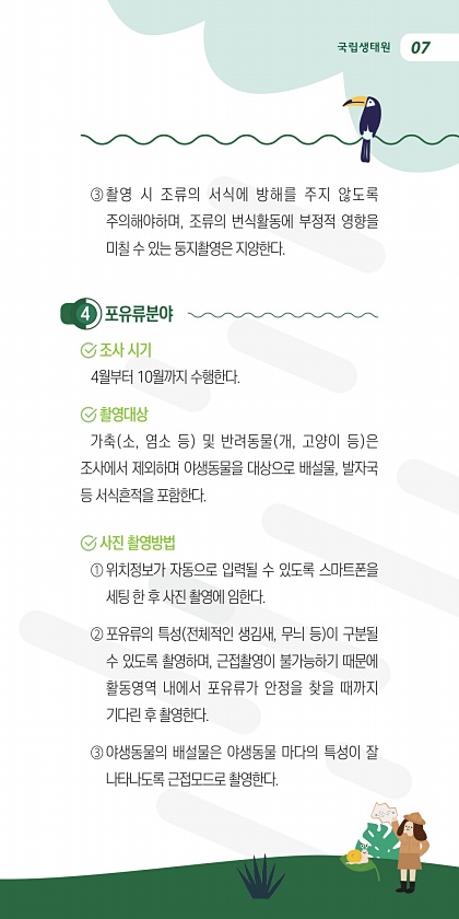 07 ③ 촬영 시 조류의 서식에 방해를 주지 않도록 주의해야하며, 조류의 번식활동에 부정적 영향을 미칠 수 있는 둥지촬영은 지양한다. 4 포유류분야 조사 시기 4월부터 10월까지 수행한다. 촬영대상 가축 소, 염소 등 및 반려동물 개, 고양이 등 은 조사에서 제외하며 야생동물을 대상으로 배설물, 발자국 등 서식흔적을 포함한다. 사진 촬영방법 ① 위치정보가 자동으로 입력될 수 있도록 스마트폰을 세팅 한 후 사진 촬영에 임한다. ② 포유류의 특성 전체적인 생김새, 무늬 등 이 구분될 수 있도록 촬영하며, 근접촬영이 불가능하기 때문에 활동영역 내에서 포유류가 안정을 찾을 때까지 기다린 후 촬영한다. ③ 야생동물의 배설물은 야생동물 마다의 특성이 잘 나타나도록 근접모드로촬영한다.