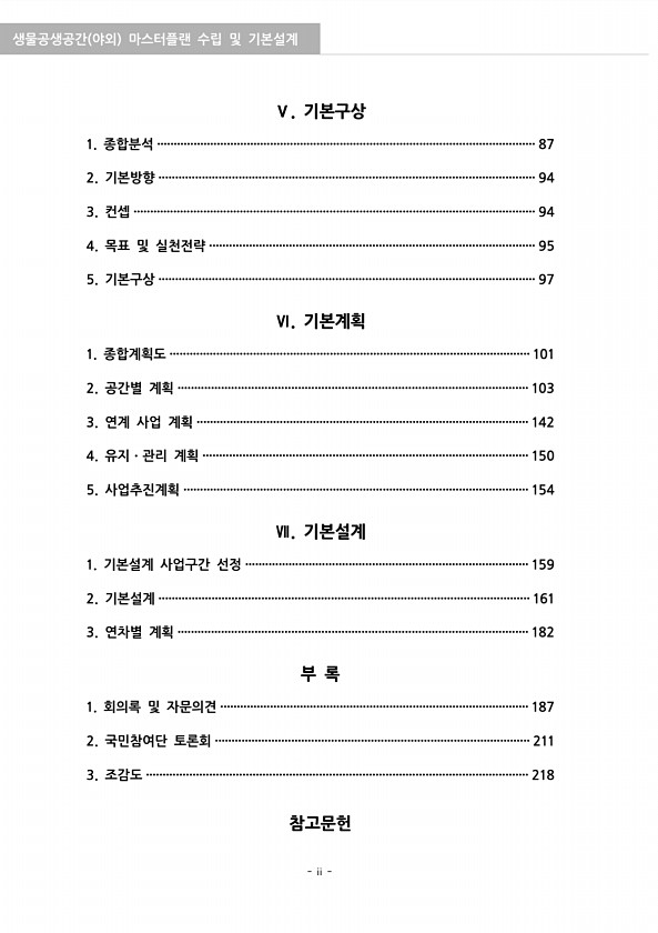 생물공생공간 야외 마스터플랜 수립 및 기본설계 ii Ⅴ. 기본구상 1. 종합분석 ·················································································································· 87 2. 기본방향 ················································································································· 94 3. 컨셉 ··········································································································...