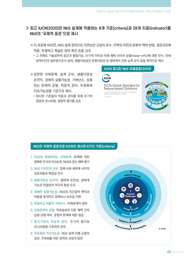 05 기후위기 대응을 위한 자연기반해법 NbS 의 국제논의 동향과 시사점 최근 IUCN 2020 은 NbS 설계에 적용하는 8개 기준 criteria 과 28개 지표 indicator 를 NbS의 ‘국제적 표준’으로 제시 이 표준에 따르면, NbS 설계 원칙으로 자연보전 규정의 준수, 지역의 자연과 문화적 맥락 반영, 경관규모에 적용, 투명하고 폭넓은 참여 촉진 등을 강조 그 외에도 기술공학적 접근과 통합가능, 단기적 이익과 미래 혜택 사이의 상충 trade-offs 에 대한 인식, 전체 정책수단의 일부분으로서 설계, 생물다양성과 문화다양성 및 생태계의 진화 능력 유지 등을 원칙으로 제시 당면한 사회문제, 설계 규모, 생물다양성 순이익, 경제적 실행가능성, 거버넌스, 상충 되는 문제의 균형, 적응적 관리, ...