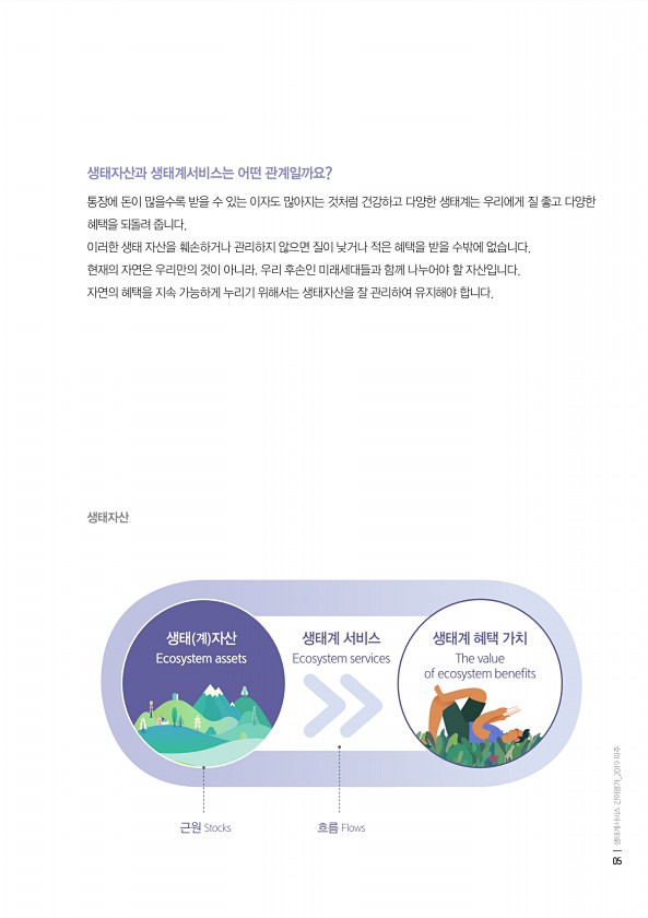 생태자산과 생태계서비스는 어떤 관계일까요? 통장에 돈이 많을수록 받을 수 있는 이자도 많아지는 것처럼 건강하고 다양한 생태계는 우리에게 질 좋고 다양한 혜택을 되돌려 줍니다. 이러한 생태 자산을 훼손하거나 관리하지 않으면 질이 낮거나 적은 혜택을 받을 수밖에 없습니다. 현재의 자연은 우리만의 것이 아니라, 우리 후손인 미래세대들과 함께 나누어야 할 자산입니다. 자연의 혜택을 지속 가능하게 누리기 위해서는 생태자산을 잘 관리하여 유지해야 합니다. 생태자산 근원 Stocks 흐름 Flows 생태 계 자산 Ecosystem assets 생태계 혜택 가치 The value of ecosystem benefits 생태계 서비스 Ecosystem services 05 생태계서비스 간이평가_2019 파주