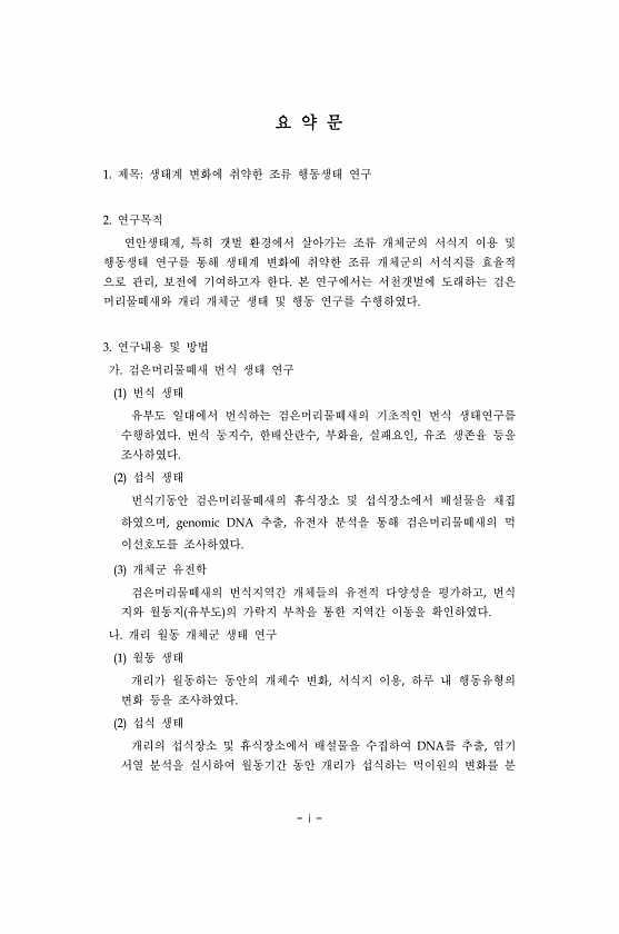 i 요 약 문 1. 제목생태계 변화에 취약한 조류 행동생태 연구 2. 연구목적 연안생태계, 특히 갯벌 환경에서 살아가는 조류 개체군의 서식지 이용 및 행동생태 연구를 통해 생태계 변화에 취약한 조류 개체군의 서식지를 효율적 으로 관리, 보전에 기여하고자 한다. 본 연구에서는 서천갯벌에 도래하는 검은 머리물떼새와 개리 개체군 생태 및 행동 연구를 수행하였다. 3. 연구내용 및 방법 가. 검은머리물떼새 번식 생태 연구 1 번식 생태 유부도 일대에서 번식하는 검은머리물떼새의 기초적인 번식 생태연구를 수행하였다. 번식 둥지수, 한배산란수, 부화율, 실패요인, 유조 생존율 등을 조사하였다. 2 섭식 생태 번식기동안 검은머리물떼새의 휴식장소 및 섭식장소에서 배설물을 채집 하였으며, genomic DNA 추출, 유전자 ...