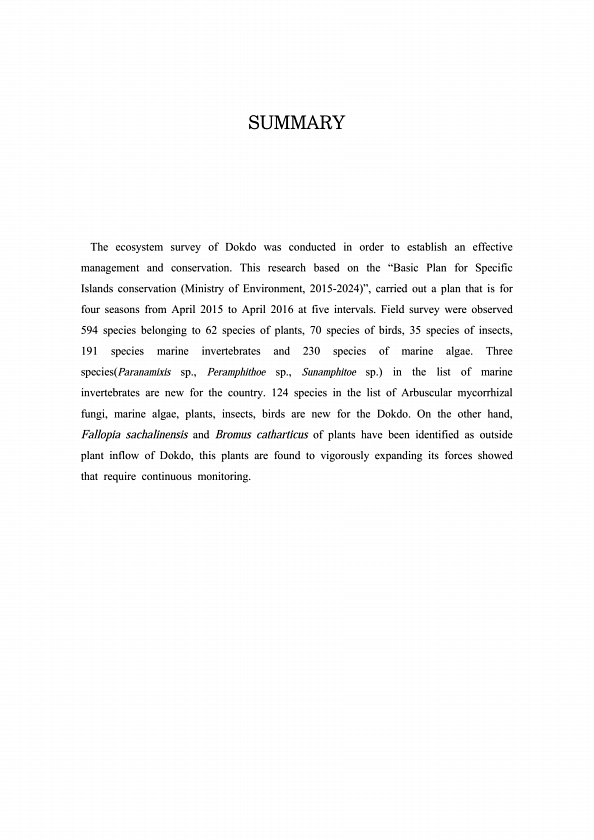 SUMMARY The ecosystem survey of Dokdo was conducted in order to establish an effective management and conservation. This research based on the “Basic Plan for Specific Islands conservation Ministry of Environment, 2015-2024 ”, carried out a plan that is for four seasons from April 2015 to April 2016 at five intervals. Field survey were observed 594 species belonging to 62 species of plants, 70 spe...