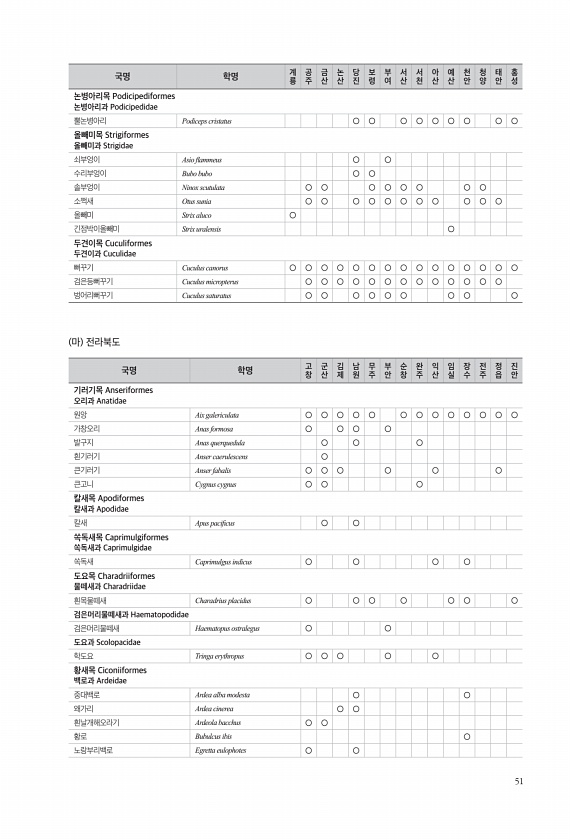 51 논병아리목 Podicipediformes 논병아리과 Podicipedidae 뿔논병아리 Podiceps cristatus ○ ○ ○ ○ ○ ○ ○ ○ ○ 올빼미목 Strigiformes 올빼미과 Strigidae 쇠부엉이 Asio fammeus ○ ○ 수리부엉이 Bubo bubo ○ ○ 솔부엉이 Ninox scutulata ○ ○ ○ ○ ○ ○ ○ ○ 소쩍새 Otus sunia ○ ○ ○ ○ ○ ○ ○ ○ ○ ○ ○ 올빼미 Strix aluco ○ 긴점박이올빼미 Strix uralensis ○ 두견이목 Cuculiformes 두견이과 Cuculidae 뻐꾸기 Cuculus canorus ○ ○ ○ ○ ○ ○ ○ ○ ○ ○ ○ ○ ○ ○ ○ 검은등뻐꾸기 Cuculus micropterus ○ ○ ○ ○ ...