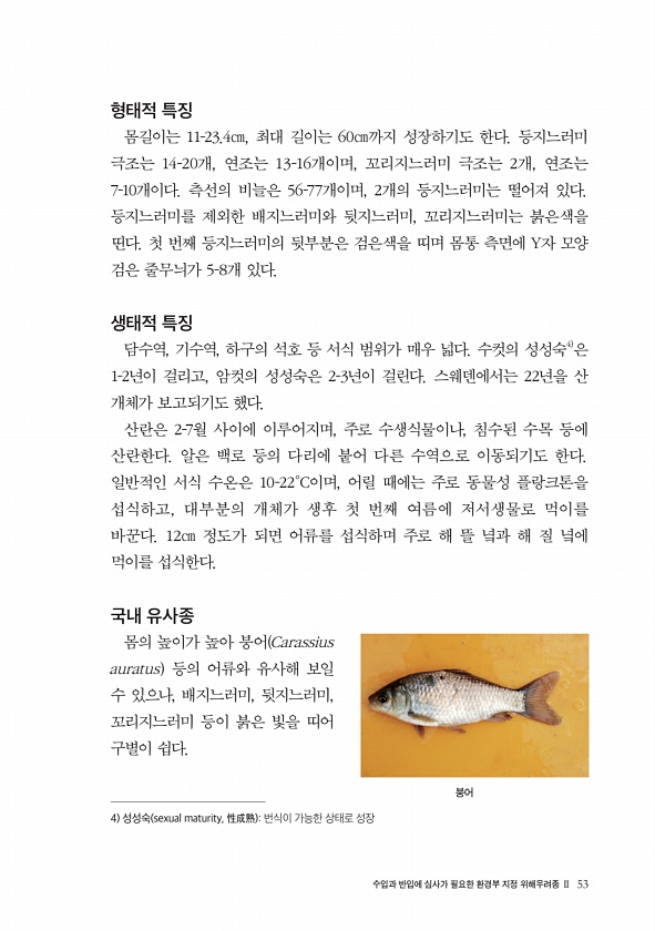 수입과 반입에 심사가 필요한 환경부 지정 위해우려종 Ⅱ 53 형태적 특징 몸길이는 11-23.4㎝, 최대 길이는 60㎝까지 성장하기도 한다. 등지느러미 극조는 14-20개, 연조는 13-16개이며, 꼬리지느러미 극조는 2개, 연조는 7-10개이다. 측선의 비늘은 56-77개이며, 2개의 등지느러미는 떨어져 있다. 등지느러미를 제외한 배지느러미와 뒷지느러미, 꼬리지느러미는 붉은색을 띤다. 첫 번째 등지느러미의 뒷부분은 검은색을 띠며 몸통 측면에 Y자 모양 검은 줄무늬가 5-8개 있다. 생태적 특징 담수역, 기수역, 하구의 석호 등 서식 범위가 매우 넓다. 수컷의 성성숙4 은 1-2년이 걸리고, 암컷의 성성숙은 2-3년이 걸린다. 스웨덴에서는 22년을 산 개체가 보고되기도 했다. 산란은 2-7월 사이에 이루어지...