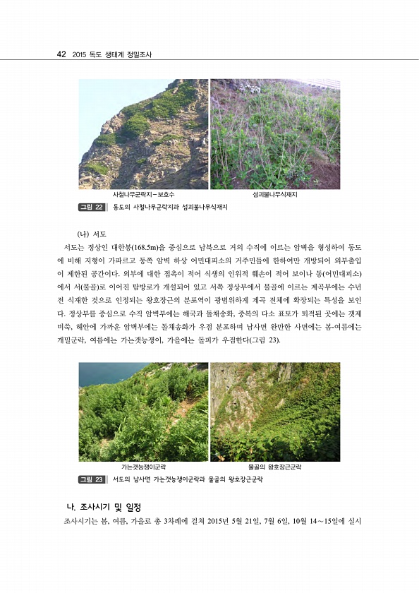 42 2015 독도 생태계 정밀조사 사철나무군락지-보호수 섬괴불나무식재지 그림 22 동도의 사철나무군락지과 섬괴불나무식재지 나 서도 서도는 정상인 대한봉 168.5m 을 중심으로 남북으로 거의 수직에 이르는 암벽을 형성하여 동도 에 비해 지형이 가파르고 동쪽 암벽 하상 어민대피소의 거주민들에 한하여만 개방되어 외부출입 이 제한된 공간이다. 외부에 대한 접촉이 적어 식생의 인위적 훼손이 적어 보이나 동 어민대피소 에서 서 물골 로 이어진 탐방로가 개설되어 있고 서쪽 정상부에서 물골에 이르는 계곡부에는 수년 전 식재한 것으로 인정되는 왕호장근의 분포역이 광범위하게 계곡 전체에 확장되는 특성을 보인 다. 정상부를 중심으로 수직 암벽부에는 해국과 돌채송화, 중복의 다소 표토가 퇴적된 곳에는 갯제 비쑥, 해안에 가까...