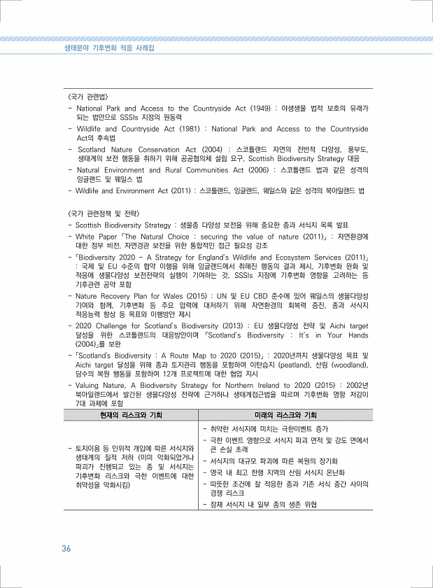 생태분야 기후변화 적응 사례집 36 국가 관련법 National Park and Access to the Countryside Act 1949 야생생물 법적 보호의 유래가 되는 법안으로 SSSIs 지정의 원동력 Wildlife and Countryside Act 1981 National Park and Access to the Countryside Act의 후속법 Scotland Nature Conservation Act 2004 스코틀랜드 자연의 전반적 다양성, 풍부도, 생태계의 보전 행동을 취하기 위해 공공협의체 설립 요구, Scottish Biodiversity Strategy 대응 Natural Environment and Rural Communities Act 2006 스코틀랜드 법과 같은 성격의 ...
