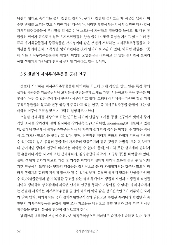 52 국가장기생태연구 니질의 형태로 축적되는 곳이 갯벌인 것이다. 우리가 갯벌에 들어섰을 때 시궁창 냄새와 비 슷한 냄새를 느끼는 것도 이러한 까닭 때문이다. 이러한 갯벌에서는 앞에서 설명한 바와 같이 저서무척추동물들이 부니질을 먹이로 삼아 소모하여 자신들의 생물량을 늘이고, 또 다른 동 물들의 먹이가 됨으로써 결국 유기오염물질의 양을 줄인다. 또한 독성을 가지고 있는 여러 종 류의 유기화합물들과 중금속들은 갯지렁이와 같은 갯벌에 서식하는 저서무척추동물들의 소 화관을 통과하면서 그 독성을 잃어버린다는 것이 일찍이 보고된 바 있다. 이처럼 갯벌은 그곳 에 사는 저서무척추동물들에 힘입어 다양한 오염물질을 정화하고 그 양을 줄이면서 오히려 해양 생태계의 다양성과 안정성 유지에 기여하고 있는 것이다. 3.5 갯벌의...
