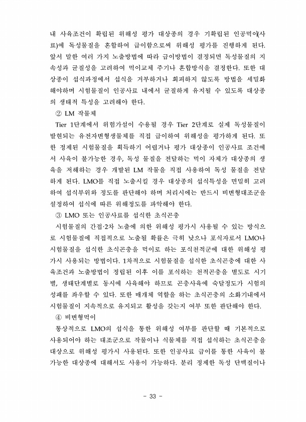 내 사육조건이 확립된 위해성 평가 대상종의 경우 기확립된 인공먹이 사 료 에 독성물질을 혼합하여 급이함으로써 위해성 평가를 진행하게 된다. 앞서 말한 여러 가지 노출방법에 따라 급이방법이 결정되면 독성물질의 지 속성과 균질성을 고려하여 먹이교체 주기나 혼합방식을 결정한다. 또한 대 상종이 섭식과정에서 섭식을 거부하거나 회피하지 않도록 방법을 세밀화 해야하며 시험물질이 인공사료 내에서 균질하게 유지될 수 있도록 대상종 의 생태적 특성을 고려해야 한다. ② LM 작물체 Tier 1단계에서 위험가설이 수용될 경우 Tier 2단계로 실제 독성물질이 발현되는 유전자변형생물체를 직접 급이하여 위해성을 평가하게 된다. 또 한 정제된 시험물질을 획득하기 어렵거나 평가 대상종이 인공사료 조건에 서 사육이 불가능한 경우, 독...