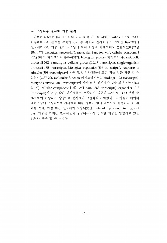 37 나. 구상나무 전사체 기능 분석 확보된 406,207개의 전사체의 기능 분석 연구를 위해, Blast2GO 프로그램을 이용하여 GO 분석을 수행하였다. 총 확보된 전사체의 13.21%인 46,603개의 전사체가 GO 기능 분류 시스템에 의해 기능적 카테고리로 분류되었다 그림 20 크게 biological process BP , molecular function MF , cellular component CC 3개의 카테고리로 분류하였다. biological process 카테고리 중, metabolic process 1,392 transcripts , cellular process 1,249 transcripts , single-organism process 1,185 transcripts , biol...
