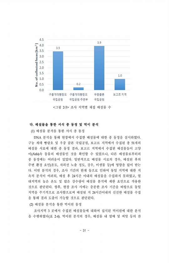 31 그림 2-5 조사 지역별 채집 배설물 수 다. 배설물을 통한 서식 종 동정 및 먹이 분석 1 배설물 분석을 통한 서식 종 동정 DNA 분석을 통해 현장에서 수집한 배설물에 대한 종 동정을 실시하였다. 구눙 게데 빵랑오 및 우중 클론 국립공원, 보고르 지역에서 수집된 총 51개의 배설물 시료에 대한 종 동정 결과, 보고르 지역에서 수집된 배설물들이 고양 이 Felis 속 동물의 배설물인 것을 확인할 수 있었으나, 다른 배설물로부터의 종 동정에는 어려움이 있었다. 일반적으로 배설물 시료의 경우, 배설된 후의 주변 환경 요인 온도, 자외선 노출 정도, 강우, 미생물 등 에 영향을 많이 받는 다. 이번 분석의 경우, 조사 기간의 한계 등으로 인하여 동일 지역에 대한 지 속적 분석이 어려워, 배설 후 24시간 ...