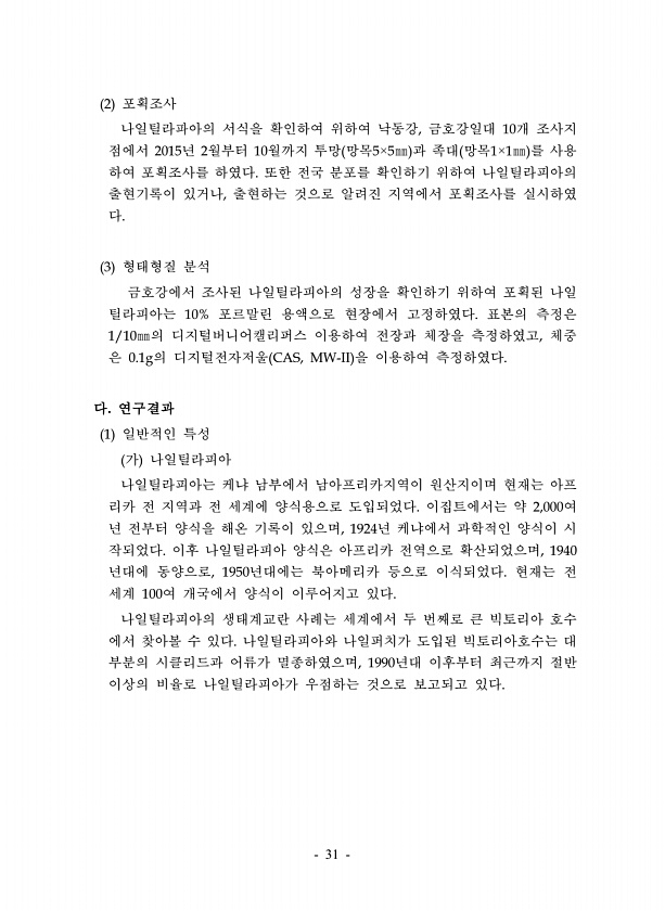 31 2 포획조사 나일틸라파아의 서식을 확인하여 위하여 낙동강, 금호강일대 10개 조사지 점에서 2015년 2월부터 10월까지 투망 망목5×5㎜ 과 족대 망목1×1㎜ 를 사용 하여 포획조사를 하였다. 또한 전국 분포를 확인하기 위하여 나일틸라피아의 출현기록이 있거나, 출현하는 것으로 알려진 지역에서 포획조사를 실시하였 다. 3 형태형질 분석 금호강에서 조사된 나일틸라피아의 성장을 확인하기 위하여 포획된 나일 틸라피아는 10% 포르말린 용액으로 현장에서 고정하였다. 표본의 측정은 1/10㎜의 디지털버니어캘리퍼스 이용하여 전장과 체장을 측정하였고, 체중 은 0.1g의 디지털전자저울 CAS, MW-II 을 이용하여 측정하였다. 다. 연구결과 1 일반적인 특성 가 나일틸라피아 나일틸라피아는 케냐 남부에서 남아프리카...