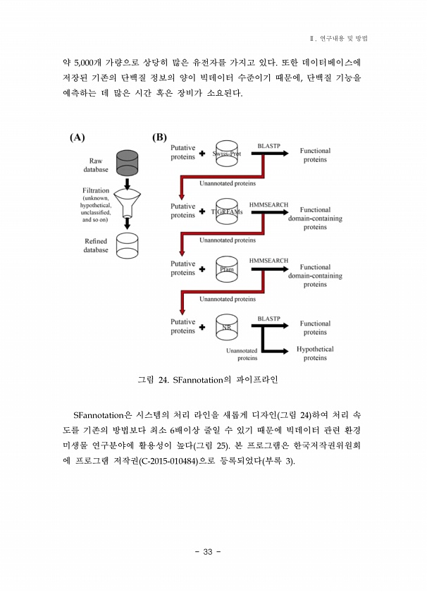 33 약 개 가량으로 상당히 많은 유전자를 가지고 있다 또한 데이터베이스에 저장된 기존의 단백질 정보의 양이 빅데이터 수준이기 때문에 단백질 기능을 예측하는 데 많은 시간 혹은 장비가 소요된다 그림 의 파이프라인 은 시스템의 처리 라인을 새롭게 디자인 그림 하여 처리 속 도를 기존의 방법보다 최소 배이상 줄일 수 있기 때문에 빅데이터 관련 환경 미생물 연구분야에 활용성이 높다 그림 본 프로그램은 한국저작권위원회 에 프로그램 저작권 으로 등록되었다 부록 Ⅱ. 연구내용 및방법