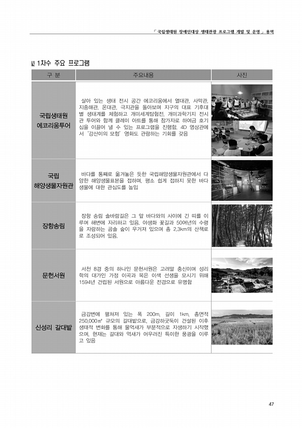 ?국립생태원 장애인대상 생태관광 프로그램 개발 및 운영? 용역 47 1차수 주요 프로그램 구 분 주요내용 사진 국립생태원 에코리움투어 살아 있는 생태 전시 공간 에코리움에서 열대관, 사막관, 지중해관, 온대관, 극지관을 돌아보며 지구의 대표 기후대 별 생태계를 체험하고 개미세계탐험전, 개미과학기지 전시 관 투어와 함께 클레이 아트를 통해 참가자로 하여금 호기 심을 이끌어 낼 수 있는 프로그램을 진행함. 4D 영상관에 서‘강산이의 모험’영화도 관람하는 기회를 갖음 국립 해양생물자원관 바다를 통째로 옮겨놓은 듯한 국립해양생물자원관에서 다 양한 해양생물표본을 접하며, 평소 쉽게 접하지 못한 바다 생물에 대한 관심도를 높임 장항송림 장항 송림 솔바람길은 그 앞 바다와의 사이에 긴 띠를 이 루며 해변에 자리하고 있음...
