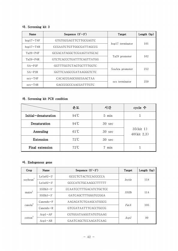 42 다. Screening kit 3 Name Sequence 5’-3’ Target Length bp hsp17-T4F GTGTGCGAGTTCTTGCGAGTC hsp17 terminator 101 hsp17-T4R CCGAATCTGTTGGCGATTAGCCG Ta29-P4F GCGACATAGGCTCGAAGTATGCAC Ta29 promoter 162 Ta29-P4R GTCTCACCCTGATTTCAGTTATGG SA-P2F GGTTTGGTCTAGTGCTTTGGTC SsuAra promoter 212 SA-P2R GGTTCAAGCCGATAAGGGTCTC ocs-T4F CACACCGAGCGGCGAACTAA ocs terminator 259 ocs-T4R GACCCGCCCAACGATTTGTC 라. Screenin...