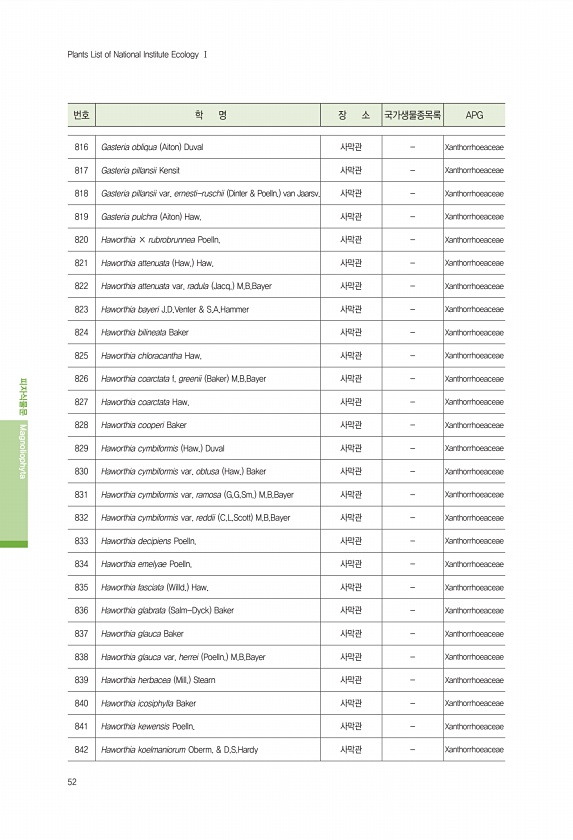 52 번호 학 명 장 소 국가생물종목록 APG 피자식물문 Magnoliophyta Plants List of National Institute Ecology Ⅰ 816 Gasteria obliqua Aiton Duval 사막관 Xanthorrhoeaceae 817 Gasteria pillansii Kensit 사막관 Xanthorrhoeaceae 818 Gasteria pillansii var. ernesti-ruschii Dinter & Poelln. van Jaarsv. 사막관 Xanthorrhoeaceae 819 Gasteria pulchra Aiton Haw. 사막관 Xanthorrhoeaceae 820 Haworthia × rubrobrunnea Poelln. 사막관 Xanthorrhoeaceae ...