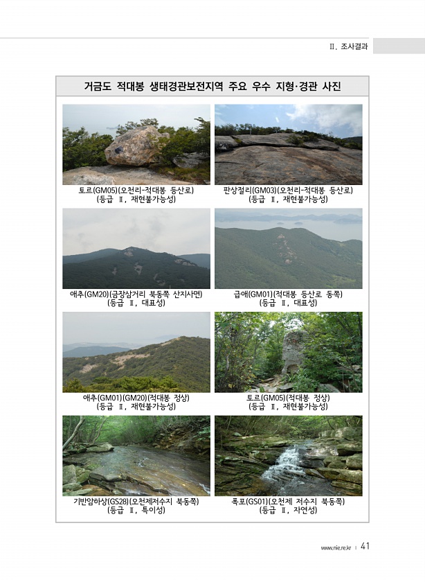 Ⅱ. 조사결과 www.nie.re.kr ? 41 거금도 적대봉 생태경관보전지역 주요 우수 지형·경관 사진 토르 GM05 오천리-적대봉 등산로 등급 Ⅱ, 재현불가능성 판상절리 GM03 오천리-적대봉 등산로 등급 Ⅱ, 재현불가능성 애추 GM20 금장삼거리 북동쪽 산지사면 등급 Ⅱ, 대표성 급애 GM01 적대봉 등산로 동쪽 등급 Ⅱ, 대표성 애추 GM01 GM20 적대봉 정상 등급 Ⅱ, 재현불가능성 토르 GM05 적대봉 정상 등급 Ⅱ, 재현불가능성 기반암하상 GS28 오천제저수지 북동쪽 등급 Ⅱ, 특이성 폭포 GS01 오천제 저수지 북동쪽 등급 Ⅱ, 자연성