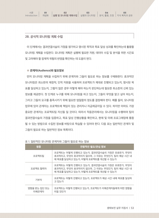 생태보전 실무 지침서 | 53 서론 Introduction 01 개념화 02 실행 및 모니터링 계획수립 03 실행과 모니터링 04 분석, 활용, 조정 05 지식 획득과 공유 2B. 공식적 모니터링 계획 수립 이 단계에서는 결과연결사슬의 가정을 평가하고 명시된 목적과 목표 달성 성과를 확인하는데 활용할 모니터링 계획을 수립한다. 모니터링 계획은 실행에 필요한 자원, 데이터 수집 및 분석을 위한 시간표 및 고려해야 할 잠재적 위험의 반영을 확인하는 데 도움이 된다. ● 관계자 Audience 와 필요정보 먼저 모니터링 계획을 수립하기 위해 관계자와 그들이 필요로 하는 정보를 구체화한다. 효과적인 모니터링은 최소한의 재정적, 인적 자원을 사용하여 프로젝트가 제대로 진행되고 있는지, 명시된 목 표를 달성하고 있는지...