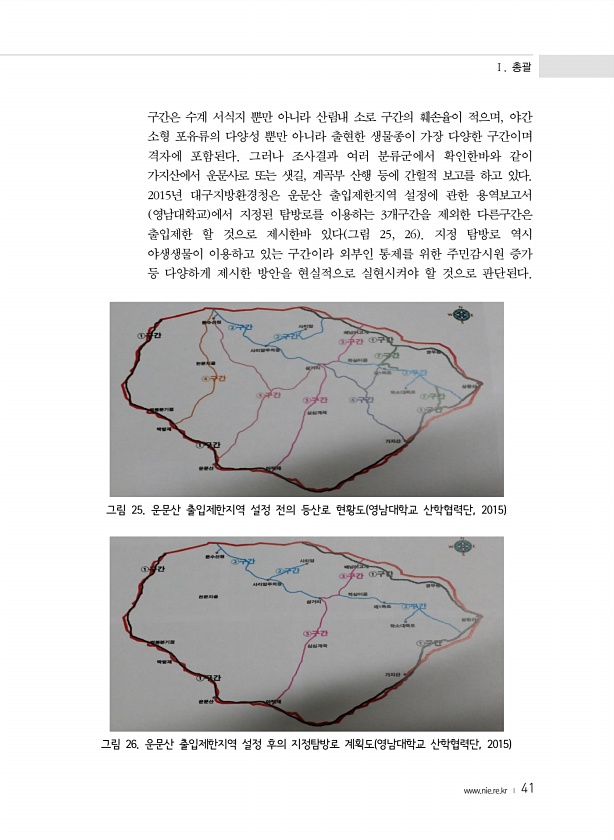 Ⅰ. 총괄 www.nie.re.kr ? 41 구간은 수계 서식지 뿐만 아니라 산림내 소로 구간의 훼손율이 적으며, 야간 소형 포유류의 다양성 뿐만 아니라 출현한 생물종이 가장 다양한 구간이며 격자에 포함된다. 그러나 조사결과 여러 분류군에서 확인한바와 같이 가지산에서 운문사로 또는 샛길, 계곡부 산행 등에 간헐적 보고를 하고 있다. 2015년 대구지방환경청은 운문산 출입제한지역 설정에 관한 용역보고서 영남대학교 에서 지정된 탐방로를 이용하는 3개구간을 제외한 다른구간은 출입제한 할 것으로 제시한바 있다 그림 25, 26 지정 탐방로 역시 야생생물이 이용하고 있는 구간이라 외부인 통제를 위한 주민감시원 증가 등 다양하게 제시한 방안을 현실적으로 실현시켜야 할 것으로 판단된다. 그림 25. 운문산 출입제한지역 ...