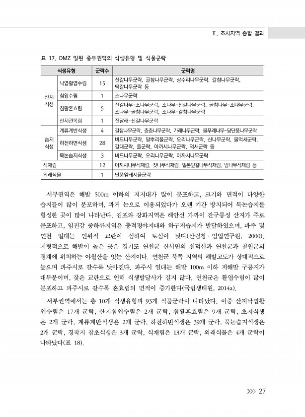 Ⅱ. 조사지역 종합 결과 27 식생유형 군락수 군락명 산지 식생 낙엽활엽수림 15 신갈나무군락, 굴참나무군락, 상수리나무군락, 갈참나무군락, 떡갈나무군락 등 침엽수림 1 소나무군락 침활혼효림 5 신갈나무-소나무군락, 소나무-신갈나무군락, 굴참나무-소나무군락, 소나무-굴참나무군락, 소나무-갈참나무군락 산지관목림 1 진달래-신갈나무군락 습지 식생 계류계반식생 4 갈참나무군락, 층층나무군락, 가래나무군락, 물푸레나무-당단풍나무군락 하천하변식생 28 버드나무군락, 달뿌리풀군락, 오리나무군락, 신나무군락, 물억새군락, 갈대군락, 줄군락, 아까시나무군락, 억새군락 등 묵논습지식생 3 버드나무군락, 오리나무군락, 아까시나무군락 식재림 12 아까시나무식재림, 잣나무식재림, 일본잎갈나무식재림, 밤나무식재림 등 외래식물 1 ...