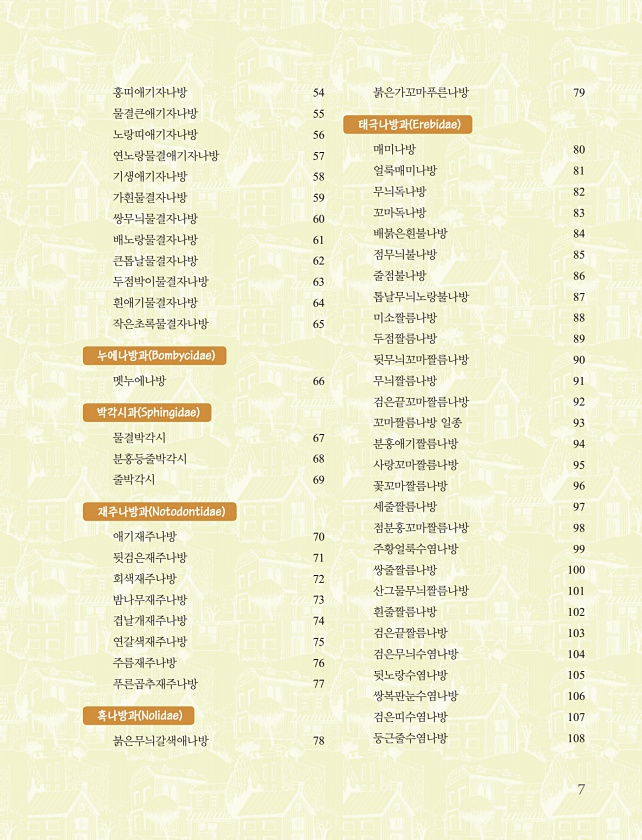 7 홍띠애기자나방 54 물결큰애기자나방 55 노랑띠애기자나방 56 연노랑물결애기자나방 57 기생애기자나방 58 가흰물결자나방 59 쌍무늬물결자나방 60 배노랑물결자나방 61 큰톱날물결자나방 62 두점박이물결자나방 63 흰애기물결자나방 64 작은초록물결자나방 65 누에나방과 Bombycidae 멧누에나방 66 박각시과 Sphingidae 물결박각시 67 분홍등줄박각시 68 줄박각시 69 재주나방과 Notodontidae 애기재주나방 70 뒷검은재주나방 71 회색재주나방 72 밤나무재주나방 73 겹날개재주나방 74 연갈색재주나방 75 주름재주나방 76 푸른곱추재주나방 77 혹나방과 Nolidae 붉은무늬갈색애나방 78 붉은가꼬마푸른나방 79 태극나방과 Erebidae 매미나방 80 얼룩매미나방 81 무늬독나방 ...
