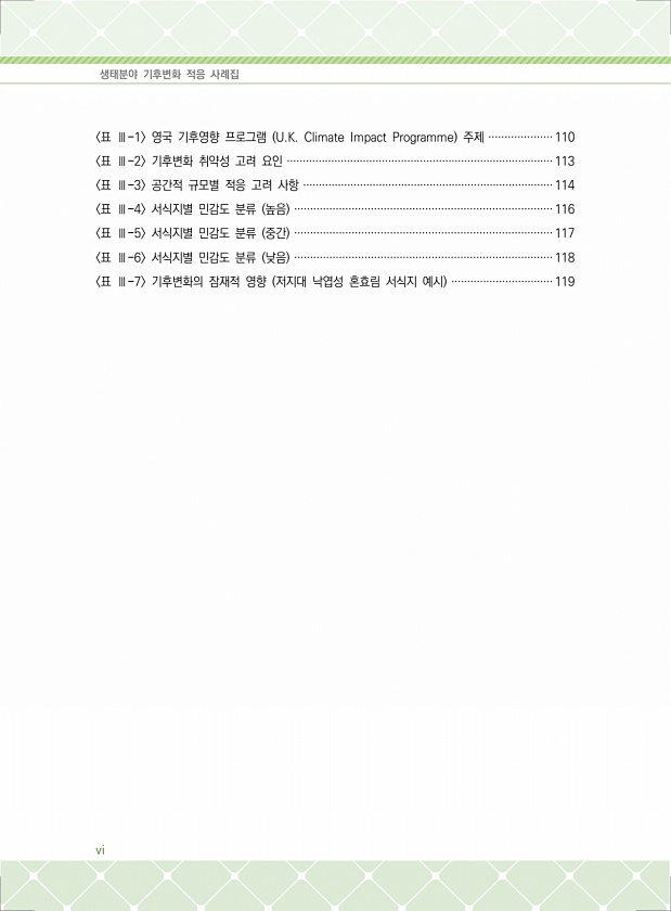 생태분야 기후변화 적응 사례집 vi 표 Ⅲ-1 영국 기후영향 프로그램 U.K. Climate Impact Programme 주제 ····················110 표 Ⅲ-2 기후변화 취약성 고려 요인 ····················································································113 표 Ⅲ-3 공간적 규모별 적응 고려 사항 ···············································································114 표 Ⅲ-4 서식지별 민감도 분류 높음 ····································································...