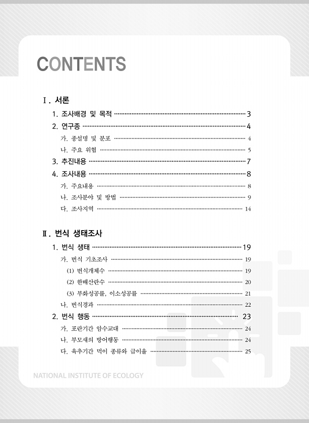 Ⅰ. 서론 1. 조사배경 및 목적 ············································································3 2. 연구종 ······························································································4 가. 종설명 및 분포 ···················································································4 나. 주요 위협 ····························································································5 ...