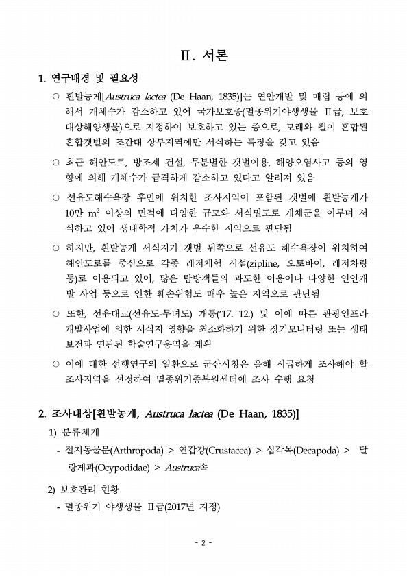 2 Ⅱ. 서론 1. 연구배경 및 필요성 ○ 흰발농게[Austruca lactea De Haan, 1835 ]는 연안개발 및 매립 등에 의 해서 개체수가 감소하고 있어 국가보호종 멸종위기야생생물 Ⅱ급, 보호 대상해양생물 으로 지정하여 보호하고 있는 종으로, 모래와 펄이 혼합된 혼합갯벌의 조간대 상부지역에만 서식하는 특징을 갖고 있음 ○ 최근 해안도로, 방조제 건설, 무분별한 갯벌이용, 해양오염사고 등의 영 향에 의해 개체수가 급격하게 감소하고 있다고 알려져 있음 ○ 선유도해수욕장 후면에 위치한 조사지역이 포함된 갯벌에 흰발농게가 10만 m² 이상의 면적에 다양한 규모와 서식밀도로 개체군을 이루며 서 식하고 있어 생태학적 가치가 우수한 지역으로 판단됨 ○ 하지만, 흰발농게 서식지가 갯벌 뒤쪽으로 선유도 해수욕장...