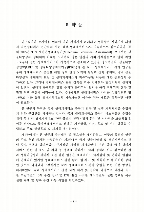 제목 : 국가 생태계서비스 평가 : 국가생태계서비스 중장기 전략 기본 구상