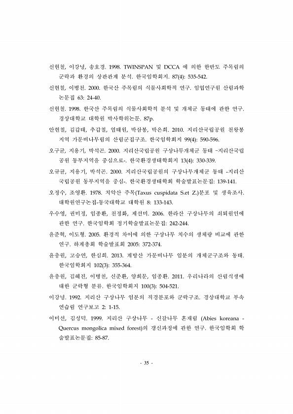 35 신현철, 이강녕, 송호경. 1998. TWINSPAN 및 DCCA 에 의한 한반도 주목림의 군락과 환경의 상관관계 분석. 한국임학회지. 87 4 535-542. 신현철, 이병천. 2000. 한국산 주목림의 식물사회학적 연구. 임업연구원 산림과학 논문집 6324-40. 신현철. 1998. 한국산 주목림의 식물사회학적 분석 및 개체군 동태에 관한 연구. 경상대학교 대학원 박사학위논문. 87p. 안현철, 김갑태, 추갑철, 엄태원, 박삼봉, 박은희. 2010. 지리산국립공원 천왕봉 지역 가문비나무림의 산림군집구조. 한국임학회지 99 4 590-596. 오구균, 지용기, 박석곤. 2000. 지리산국립공원 구상나무개체군 동태 ?지리산국립 공원 동부지역을 중심으로-. 한국환경생태학회지 13 4 330-339. 오규...
