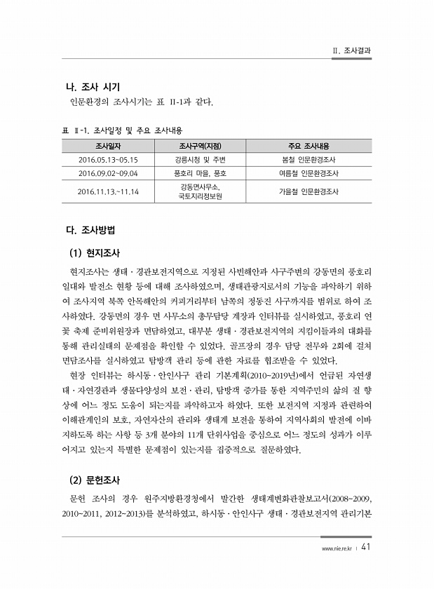 Ⅱ. 조사결과 www.nie.re.kr ? 41 나. 조사 시기 인문환경의 조사시기는 표 Ⅱ-1과 같다. 표 Ⅱ-1. 조사일정 및 주요 조사내용 조사일자 조사구역 지점 주요 조사내용 2016.05.1305.15 강릉시청 및 주변 봄철 인문환경조사 2016.09.0209.04 풍호리 마을, 풍호 여름철 인문환경조사 2016.11.13.11.14 강동면사무소, 국토지리정보원 가을철 인문환경조사 다. 조사방법 1 현지조사 현지조사는 생태·경관보전지역으로 지정된 사빈해안과 사구주변의 강동면의 풍호리 일대와 발전소 현황 등에 대해 조사하였으며, 생태관광지로서의 기능을 파악하기 위하 여 조사지역 북쪽 안목해안의 커피거리부터 남쪽의 정동진 사구까지를 범위로 하여 조 사하였다. 강동면의 경우 면 사무소의 총무담당 계장과 ...