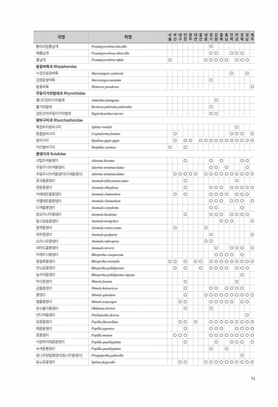 51 황머리털홍날개 Pseudopyrochroa laticollis ○ 애홍날개 Pseudopyrochroa rubricollis ○ ○ ○ ○ ○ 홍날개 Pseudopyrochroa rufula ○ ○ ○ ○ ○ ○ ○ ○ ○ 왕꽃벼룩과 Rhipiphoridae 수검은왕꽃벼룩 Macrosiagon cyaniveste ○ ○ 검정왕꽃벼룩 Macrosiagon nasutum ○ 왕꽃벼룩 Metoecus paradoxus ○ 주둥이거위벌레과 Rhynchitidae 홍다리장미거위벌레 Auletobius fumigatus ○ 뿔거위벌레 Byctiscus puberulus puberulus ○ 검은꼬마주둥이거위벌레 Haplorhynchites laevior ○ ○ 왕바구미과 Rhynchophoridae 흑점박이왕바구...