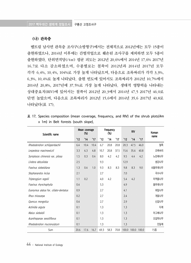 2017 백두대간 생태계 정밀조사 구룡산 고정조사구 44 ? National Institute of Ecology 나 관목층 벨트림 남사면 관목층 조사구 소방형구 에서는 전체적으로 2012년에는 모두 15종이 출현하였으나, 2014년 이후에는 간벌작업으로 훼손된 조사구를 제외하면 모두 5종이 출현하였다. 단위면적당 /4㎡ 평균 피도는 2012년 20.6%에서 2014년 17.6% 2017년 16.7로 다소 감소하였으며, 수종별로는 철쭉이 2012년과 2014년 2017년 모두 각각 6.4%, 10.4%, 104%로 가장 높게 나타났으며, 다음으로 조록싸리가 각각 3.3%, 6.3%, 10.4%로 높게 나타났다. 출현 빈도에 있어서도 조록싸리가 2012년 10.7%에서 2014년 20.8%, 2017년에 37...