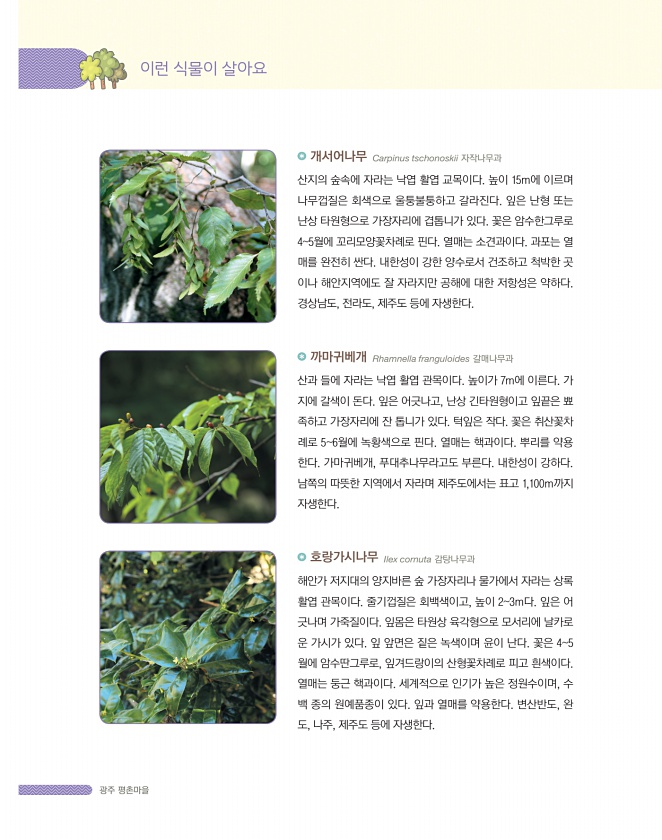 광주 평촌마을 개서어나무 Carpinus tschonoskii 자작나무과 산지의 숲속에 자라는 낙엽 활엽 교목이다. 높이 15m에 이르며 나무껍질은 회색으로 울퉁불퉁하고 갈라진다. 잎은 난형 또는 난상 타원형으로 가장자리에 겹톱니가 있다. 꽃은 암수한그루로 45월에 꼬리모양꽃차례로 핀다. 열매는 소견과이다. 과포는 열 매를 완전히 싼다. 내한성이 강한 양수로서 건조하고 척박한 곳 이나 해안지역에도 잘 자라지만 공해에 대한 저항성은 약하다. 경상남도, 전라도, 제주도 등에 자생한다. 까마귀베개 Rhamnella franguloides 갈매나무과 산과 들에 자라는 낙엽 활엽 관목이다. 높이가 7m에 이른다. 가 지에 갈색이 돈다. 잎은 어긋나고, 난상 긴타원형이고 잎끝은 뾰 족하고 가장자리에 잔 톱니가 있다. ...