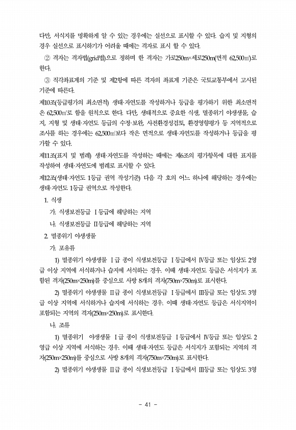 41 다만, 서식지를 명확하게 알 수 있는 경우에는 실선으로 표시할 수 있다. 습지 및 지형의 경우 실선으로 표시하기가 어려울 때에는 격자로 표시 할 수 있다. ② 격자는 격자법 grid법 으로 정하며 한 격자는 가로250m×세로250m 면적 62,500㎡ 로 한다. ③ 직각좌표계의 기준 및 제2항에 따른 격자의 좌표계 기준은 국토교통부에서 고시된 기준에 따른다. 제10조 등급평가의 최소면적 생태·자연도를 작성하거나 등급을 평가하기 위한 최소면적 은 62,500㎡로 함을 원칙으로 한다. 다만, 생태적으로 중요한 식생, 멸종위기 야생생물, 습 지, 지형 및 생태·자연도 등급의 수정·보완, 사전환경성검토, 환경영향평가 등 지역적으로 조사를 하는 경우에는 62,500㎡보다 작은 면적으로 생태·자연도를 작성하거나 ...
