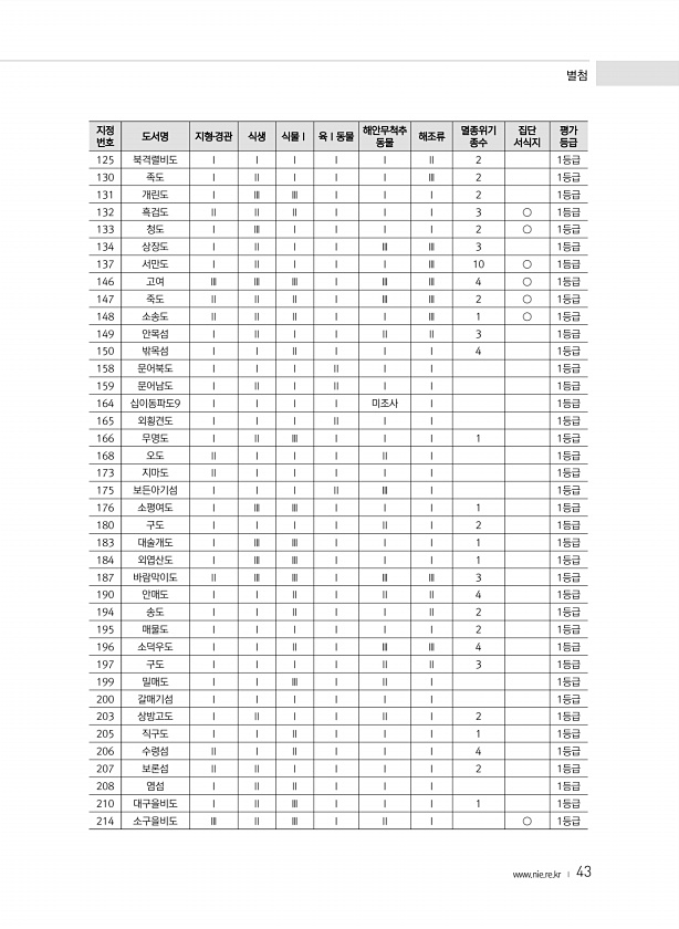 별첨 www.nie.re.kr ? 43 지정 번호 도서명 지형?경관 식생 식물Ⅰ 육Ⅰ동물 해안무척추 동물 해조류 멸종위기 종수 서식지 집단 평가 등급 125 북격렬비도 Ⅰ Ⅰ Ⅰ Ⅰ Ⅰ Ⅱ 2 1등급 130 족도 Ⅰ Ⅱ Ⅰ Ⅰ Ⅰ Ⅲ 2 1등급 131 개린도 Ⅰ Ⅲ Ⅲ Ⅰ Ⅰ Ⅰ 2 1등급 132 흑검도 Ⅱ Ⅱ Ⅱ Ⅰ Ⅰ Ⅰ 3 ○ 1등급 133 청도 Ⅰ Ⅲ Ⅰ Ⅰ Ⅰ Ⅰ 2 ○ 1등급 134 상장도 Ⅰ Ⅱ Ⅰ Ⅰ Ⅲ Ⅲ 3 1등급 137 서만도 Ⅰ Ⅱ Ⅰ Ⅰ Ⅰ Ⅲ 10 ○ 1등급 146 고여 Ⅲ Ⅲ Ⅲ Ⅰ Ⅲ Ⅲ 4 ○ 1등급 147 죽도 Ⅱ Ⅱ Ⅱ Ⅰ Ⅲ Ⅲ 2 ○ 1등급 148 소송도 Ⅱ Ⅱ Ⅱ Ⅰ Ⅰ Ⅲ 1 ○ 1등급 149 안목섬 Ⅰ Ⅱ Ⅰ Ⅰ Ⅱ Ⅱ 3 1등급 150 밖목섬 Ⅰ Ⅰ Ⅱ Ⅰ Ⅰ Ⅰ...