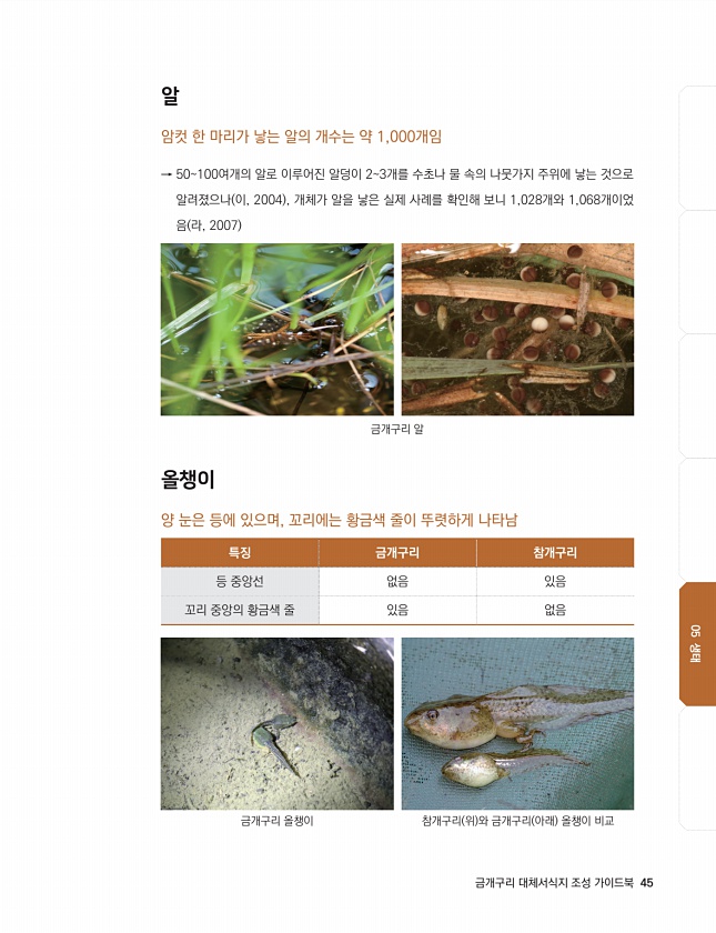 05 생태 특징 금개구리 참개구리 등 중앙선 없음 있음 꼬리 중앙의 황금색 줄 있음 없음 알 암컷 한 마리가 낳는 알의 개수는 약 1,000개임 → 50100여개의 알로 이루어진 알덩이 23개를 수초나 물 속의 나뭇가지 주위에 낳는 것으로 알려졌으나 이, 2004 , 개체가 알을 낳은 실제 사례를 확인해 보니 1,028개와 1,068개이었 음 라, 2007 올챙이 양 눈은 등에 있으며, 꼬리에는 황금색 줄이 뚜렷하게 나타남 금개구리 알 금개구리 올챙이 참개구리 위 와 금개구리 아래 올챙이 비교 금개구리 대체서식지 조성 가이드북45