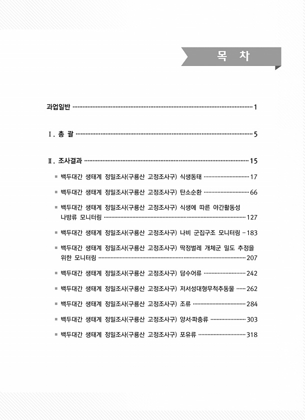 목 차 과업일반 ·············································································································1 Ⅰ. 총 괄 ···········································································································5 Ⅱ. 조사결과 ···································································································15 ? 백두대간 생태계 정밀조사 구룡산 고정조사구 식생동태 ·······················...