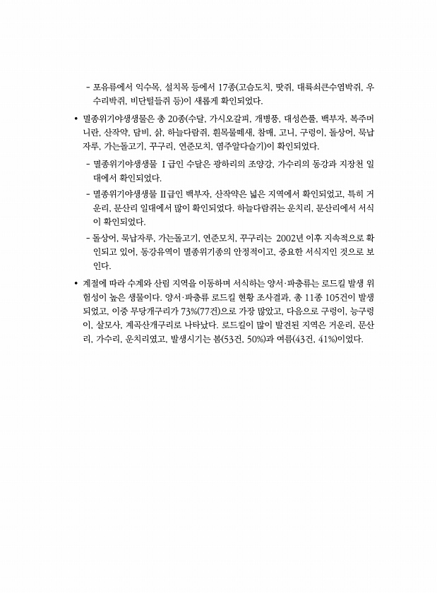 포유류에서 익수목, 설치목 등에서 17종 고슴도치, 땃쥐, 대륙쇠큰수염박쥐, 우 수리박쥐, 비단털들쥐 등 이 새롭게 확인되었다. ? 멸종위기야생생물은 총 20종 수달, 가시오갈피, 개병풍, 대성쓴풀, 백부자, 복주머 니란, 산작약, 담비, 삵, 하늘다람쥐, 흰목물떼새, 참매, 고니, 구렁이, 돌상어, 묵납 자루, 가는돌고기, 꾸구리, 연준모치, 염주알다슬기 이 확인되었다. 멸종위기야생생물 Ⅰ급인 수달은 광하리의 조양강, 가수리의 동강과 지장천 일 대에서 확인되었다. 멸종위기야생생물 Ⅱ급인 백부자, 산작약은 넓은 지역에서 확인되었고, 특히 거 운리, 문산리 일대에서 많이 확인되었다. 하늘다람쥐는 운치리, 문산리에서 서식 이 확인되었다. 돌상어, 묵납자루, 가는돌고기, 연준모치, 꾸구리는 2002년 이후 지속적...