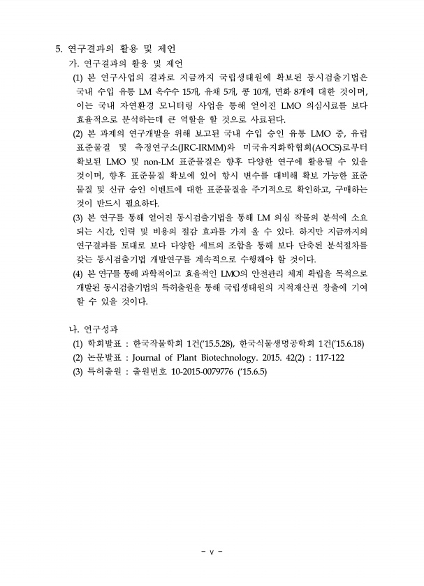 5. 연구결과의 활용 및 제언 가. 연구결과의 활용 및 제언 1 본 연구사업의 결과로 지금까지 국립생태원에 확보된 동시검출기법은 국내 수입 유통 LM 옥수수 15개, 유채 5개, 콩 10개, 면화 8개에 대한 것이며, 이는 국내 자연환경 모니터링 사업을 통해 얻어진 LMO 의심시료를 보다 효율적으로 분석하는데 큰 역할을 할 것으로 사료된다. 2 본 과제의 연구개발을 위해 보고된 국내 수입 승인 유통 LMO 중, 유럽 표준물질 및 측정연구소 JRC-IRMM 와 미국유지화학협회 AOCS 로부터 확보된 LMO 및 non-LM 표준물질은 향후 다양한 연구에 활용될 수 있을 것이며, 향후 표준물질 확보에 있어 항시 변수를 대비해 확보 가능한 표준 물질 및 신규 승인 이벤트에 대한 표준물질을 주기적으로 확인하고, 구매...