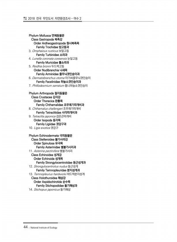 2018 전국 무인도서 자연환경조사 여수 2 44 ? National Institute of Ecology Phylum Mollusca 연체동물문 Class Gastropoda 복족강 Order Ardheogastropoda 원시복족목 Family Trochidae 밤고둥과 3. Omphaious rusticus 보말고둥 Family Turbinidae 소라과 4. Lunella coronata coreensis 눈알고둥 Family Muricidae 뿔소라과 5. Reidhia bronni 두드럭고둥 Order Nudibranchia 나새목 Family Arminidae 줄무늬갯민숭이과 6. Dermatobranchus otome 아가씨줄무늬갯민숭이 Family Facelinidae 하늘소갯민숭이과 7. ...