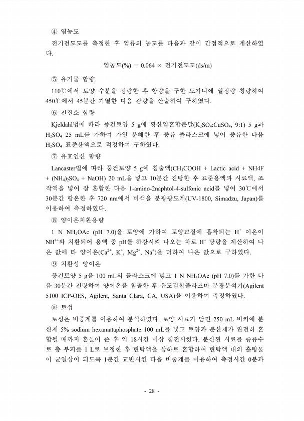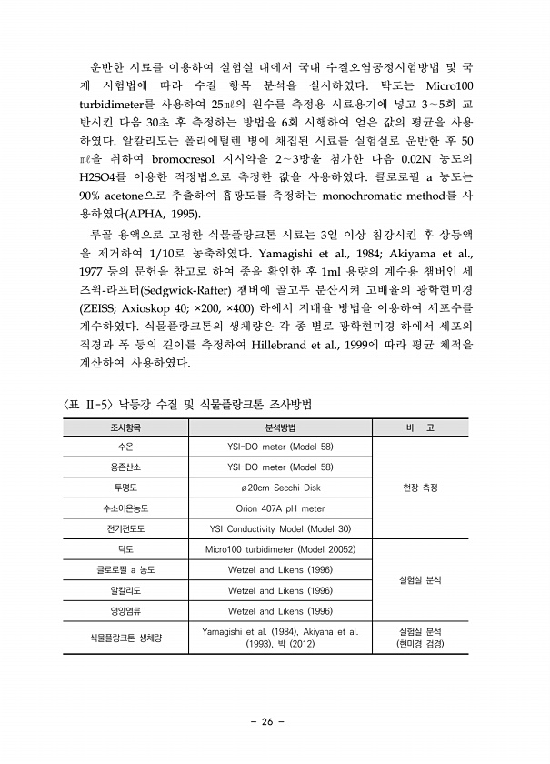26 운반한 시료를 이용하여 실험실 내에서 국내 수질오염공정시험방법 및 국 제 시험법에 따라 수질 항목 분석을 실시하였다. 탁도는 Micro100 turbidimeter를 사용하여 25㎖의 원수를 측정용 시료용기에 넣고 3∼5회 교 반시킨 다음 30초 후 측정하는 방법을 6회 시행하여 얻은 값의 평균을 사용 하였다. 알칼리도는 폴리에틸렌 병에 채집된 시료를 실험실로 운반한 후 50 ㎖을 취하여 bromocresol 지시약을 2∼3방울 첨가한 다음 0.02N 농도의 H2SO4를 이용한 적정법으로 측정한 값을 사용하였다. 클로로필 a 농도는 90% acetone으로 추출하여 흡광도를 측정하는 monochromatic method를 사 용하였다 APHA, 1995 루골 용액으로 고정한 식물플랑크톤 시료는 3일 이...