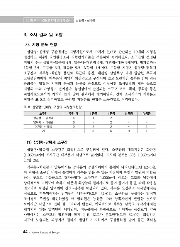 2018 백두대간보호지역 생태계 조사 삽당령 신배령 44 ? National Institute of Ecology 3. 조사 결과 및 고찰 가. 지형 분포 현황 삽당령신배령 구간에서는 지형자원으로서 가치가 있다고 판단되는 19개의 지형을 선정하고 제4차 자연환경조사 지형평가기준을 적용하여 평가하였다. 소구간별 선정된 지형의 수는 삽당령닭목재 4개, 닭목재대관령 6개, 대관령매봉 9개이다. 평가결과는 1등급 3개, Ⅱ등급 6개, Ⅲ등급 9개, Ⅳ등급 1개이다. Ⅰ등급 지형은 삽당령닭목재 소구간의 석두봉화란봉 등산로 부근의 용천, 대관령 삼양목장 내에 발달한 우곡과 고위평탄면이다. 대부분의 지역이 화강암으로 구성되어 있고 오랜기간 풍화를 받아 깊은 풍화층이 발달한 지형의 특성과 능선을 중심으로 이루어진 조사방법...