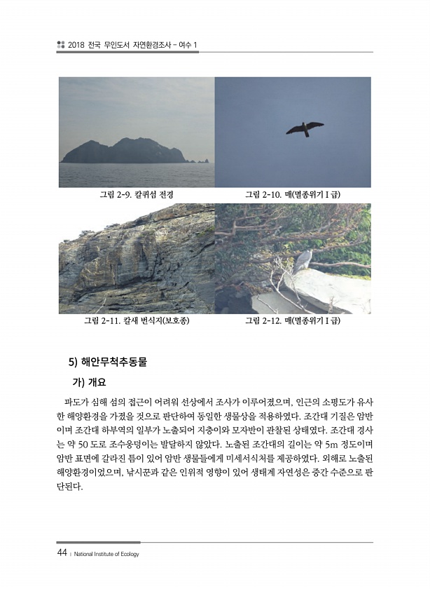 2018 전국 무인도서 자연환경조사 여수 1 44 ? National Institute of Ecology 그림 2-9. 칼퀴섬 전경 그림 2-10. 매 멸종위기Ⅰ급 그림 2-11. 칼새 번식지 보호종 그림 2-12. 매 멸종위기Ⅰ급 5 파도가 심해 섬의 접근이 어려워 선상에서 조사가 이루어졌으며, 인근의 소평도가 유사 한 해양환경을 가졌을 것으로 판단하여 동일한 생물상을 적용하였다. 조간대 기질은 암반 이며 조간대 하부역의 일부가 노출되어 지충이와 모자반이 관찰된 상태였다. 조간대 경사 는 약 50 도로 조수웅덩이는 발달하지 않았다. 노출된 조간대의 길이는 약 5m 정도이며 암반 표면에 갈라진 틈이 있어 암반 생물들에게 미세서식처를 제공하였다. 외해로 노출된 해양환경이었으며, 낚시꾼과 같은 인위적 영향이 ...