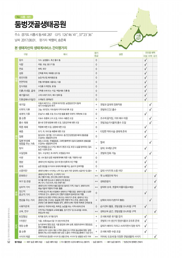 군산 001 No. 시흥 본 생태자산의 생태계서비스 간이평가지 구분 예시 평가 등급 설명 규모별 혜택 지점 지역 국가 공급 담수 식수, 농업용수, 축산 용수 등 0 √ 식량 곡물, 과실, 물고기 등 0 √ 연료 화목, 토탄 0 √ 섬유 건축용 목재, 의류용 섬유 등 0 √ 유전자원 농업·축산업 희귀품종 등 0 √ 천연약재 전통 의약품에 사용되는 식물 0 √ 장식재료 수집용 조개껍질, 꽃 등 0 √ 진흙,미네랄, 골재 건축용 모래 또는 자갈, 벽돌재료 진흙 등 0 √ 폐기물처리 고체 쓰레기 하치, 폐수 방류 등 0 √ 친환경에너지발전 조력발전, 풍력발전 0 √ 조절 대기질 자동차 배기가스, 산업체 대기오염, 농업발생 먼지 등의 대기 미세물질의 제거 + 갯벌과 갈대의 정화작용 √ 지역적 기후 그늘, 대기온도 저...