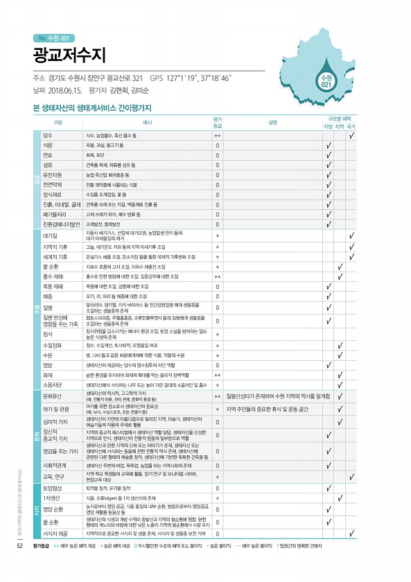 No. 수원- 수원 021 본 생태자산의 생태계서비스 간이평가지 구분 예시 평가 등급 설명 규모별 혜택 지점 지역 국가 공급 담수 식수, 농업용수, 축산 용수 등 ++ √ 식량 곡물, 과실, 물고기 등 0 √ 연료 화목, 토탄 0 √ 섬유 건축용 목재, 의류용 섬유 등 0 √ 유전자원 농업·축산업 희귀품종 등 0 √ 천연약재 전통 의약품에 사용되는 식물 0 √ 장식재료 수집용 조개껍질, 꽃 등 0 √ 진흙, 미네랄, 골재 건축용 모래 또는 자갈, 벽돌재료 진흙 등 0 √ 폐기물처리 고체 쓰레기 하치, 폐수 방류 등 0 √ 친환경에너지발전 조력발전, 풍력발전 0 √ 조절 대기질 자동차 배기가스, 산업체 대기오염, 농업발생 먼지 등의 대기 미세물질의 제거 + √ 지역적 기후 그늘, 대기온도 저하 등의 지역 미세...