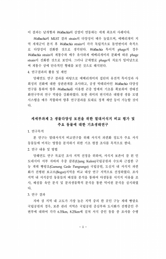 ii 이 결과는 날개형과 Wolbachia의 감염이 연동하는 세계 최초의 사례이다. Wolbachia의 MLST 결과 strain의 다양성이 매우 높았으며, 에메리개미 지 역 개체군이 분지 후 Wolbachia strain이 각각 독립적으로 돌연변이의 축적으 로 다양성이 진화한 것으로 생각된다. Wolbachia 특이적 phage의 경우 Wolbachia strain의 계통수와 매우 유사하게 에메리개미의 분화에 따른 phage strain이 진화한 것으로 보인다. 그러나 군체별로 phage의 치료가 일어남으로 써 계통수 상에 단속적인 형태를 보인 것으로 해석된다. 4. 연구결과의 활용 및 제언 당해연도 연구 결과를 바탕으로 에메리개미의 집단의 유전적 특이성과 사 회성의 진화에 대한 상관관계를 조사하고, 공생...